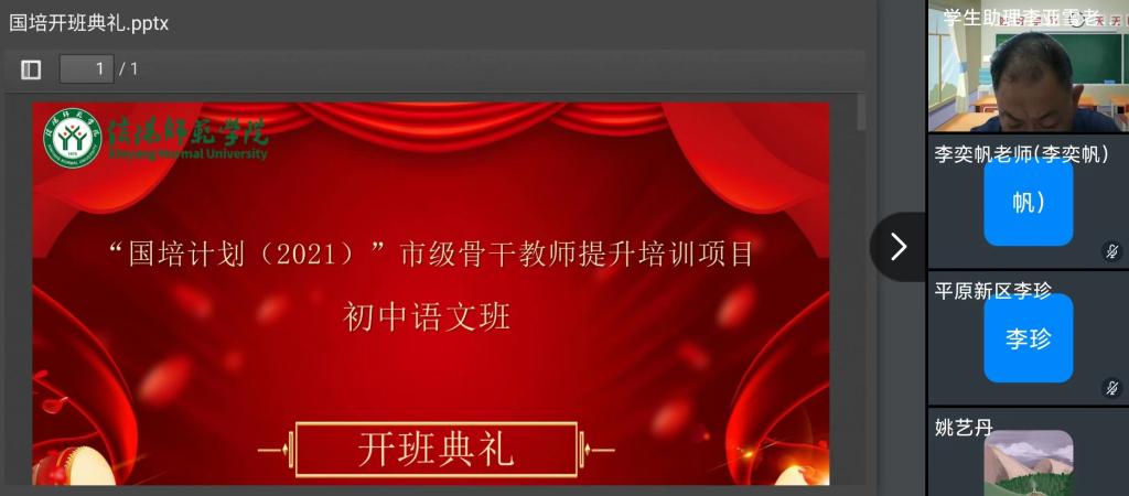 2022年5月24日上午,“国培(2021)”市级骨干教师能力提升培训项目初中语文班开班典礼在钉钉平台线上举行。William威廉英国副院长缑广飞和来自全省的50名初中语文骨干教师参加。会议由萧晟洁老师主持。