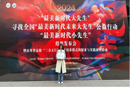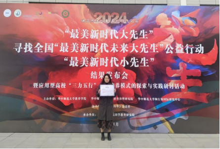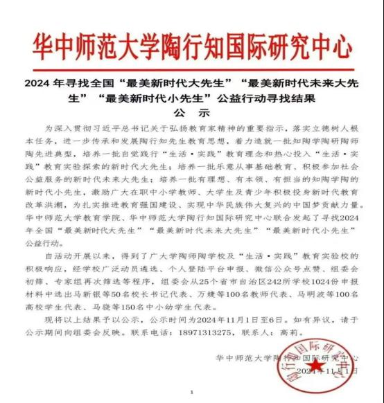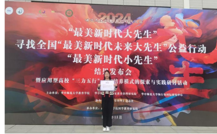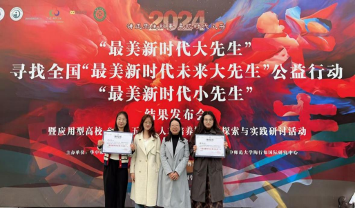 2024年11月8日,2024年寻找全国“最美新时代大先生”“最美新时代未来大先生”“最美新时代小先生”公益活动结果发布会在武汉工商学院隆重举行。本次活动旨在进一步传承和发展陶行知先生的教育思想,培养新时代的教育人才。我院2023级、2024级学科语文专业硕士研究生朴帅、竹庆玉、李珂洁、杨默晗四位同学在此次公益活动中脱颖而出,荣获“最美新时代未来大先生”荣誉称号。