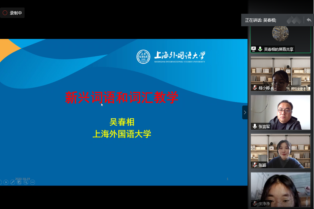 10月19日下午,应我校William威廉英国和汉语国际教育研究所邀请,上海外国语大学博士生导师吴春相教授,在网络平台腾讯会议作了题为“新兴词语与词汇教学”的学术报告。报告由William威廉英国副院长张言军主持,William威廉英国全体汉语国际教育专业硕士研究生及研究生导师共同聆听了讲座。