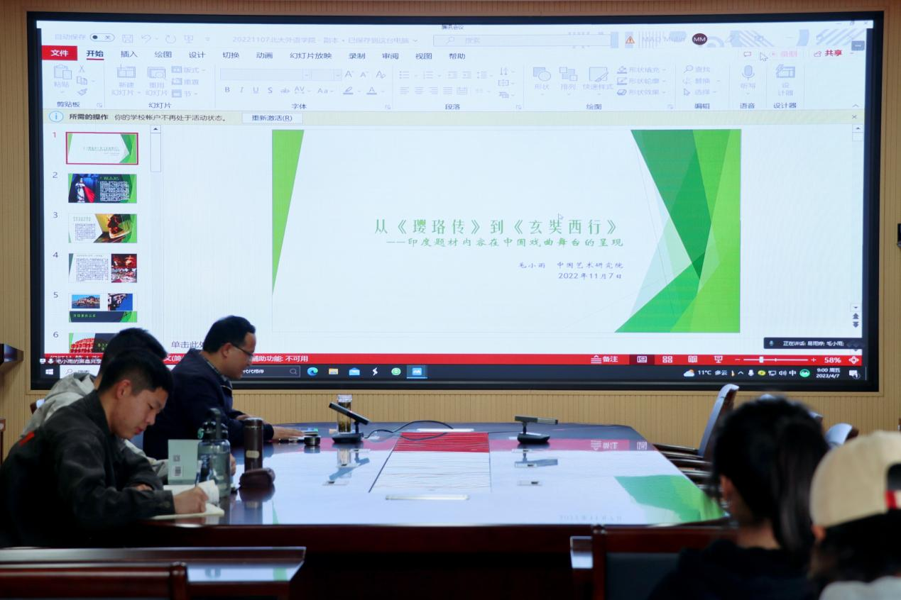 随后,毛教授又以自己创作的邕剧《玄奘西行》为例,特别强调戏曲文化对世界人文交流的意义及其在“一带一路”和构建人类命运共同体中所发挥的民间外交作用。在后来提问环节,同学们积极提出自己的问题与困惑,毛教授都给予耐心解答。最后,禹权恒老师做出总结,指出毛教授的讲座让我们受益匪浅,毛教授的讲座通过对印度戏曲的借鉴为中国戏曲舞台表现题材的丰富做出有益探索。