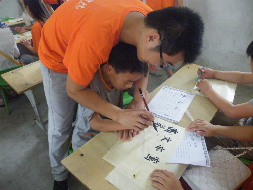活动伊始,小朋友们热情地和志愿者们交朋友并带领他们参观自己的学校,同时志愿者们与孩子们进行一对一的谈心交流,询问他们的学习、生活等情况还帮助他们简单解决学习问题。接着,志愿者们带领大家学习国学经典《弟子规》,在朗读、解释的过程中使孩子们能够更好的接触国学知识,对国学精划有初步了解。在《弟子规》朗读学习期间,主讲人对同学们进行简单的有奖问答,同学们积极踊跃发言,课堂气氛十分融洽热烈。休息间歇,志愿者魏蓝天带领孩子们唱起了儿歌,使得整个校园里边充满着孩子们与志愿者的悠扬歌声。随后,我院志愿者拿出准备好的笔墨纸砚手把手教孩子们练习毛笔字,孩子们对我国传统的书法表现出了浓厚的兴趣,个个跃跃欲试,参与到毛笔字书写当中。义务支教,志愿者们不仅仅要教给小朋友丰富的知识,更要培养、调动他们学习的兴趣和积极性,同时让孩子们的暑期生活更充实,让他们得到身心方面的锻炼。最后,志愿者和孩子们合影留念,此次的支教活动也圆满落幕。