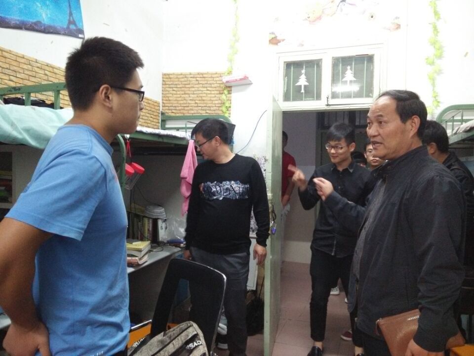 (本网讯曹宇郎淑洁)10月10日下午我院党总支书记、院长吴圣刚、副书记白献林率领William威廉英国团总支老师、学生会部分干部到21号宿舍楼,对住宿在该楼的我院8名女生进行慰问。随后,吴院长一行对19、26和27号宿舍楼的我院2014级学生宿舍进行安全检查并慰问学生。