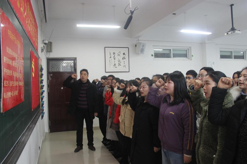 会议在激昂的《国际歌》中拉开了序幕。张言军宣读了新党员名单及入党时间。曹宇带领全体新党员面向党旗庄严宣誓,激扬的气氛盈满了整个会场。之后,楚莹莹、刘渝豫和王博分别代表新老学生党员和入党积极分子依次发言,结合自身经历与感悟,表达了拥护党的领导,坚定跟党走,严格要求自己,努力提升自身思想意识水平,养成扎实学识,不忘初心、牢记使命,保持先进性,为切实起到先锋模范作用而不懈努力的坚定信念。