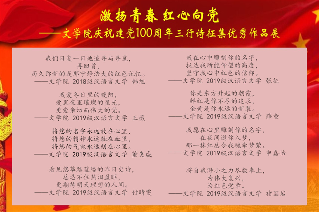 百年风雨兼程,百年激流勇进,百年的瞬息万变见证了中国共产党大无畏的牺牲精神和民族气节。在这样一个重要节点,通过“三行诗”的方式致敬党的百年华诞,增强了文院学子的爱国情怀和民族自豪感,使广大学子做到知史爱党,知史爱国。同时,有助于提高我院学子专业素养,激励他们以青春之我,担青春之责,增强为国家富强、民族复兴而奋斗的本领,在党和人民需要的地方绽放出青春的绚烂之花。