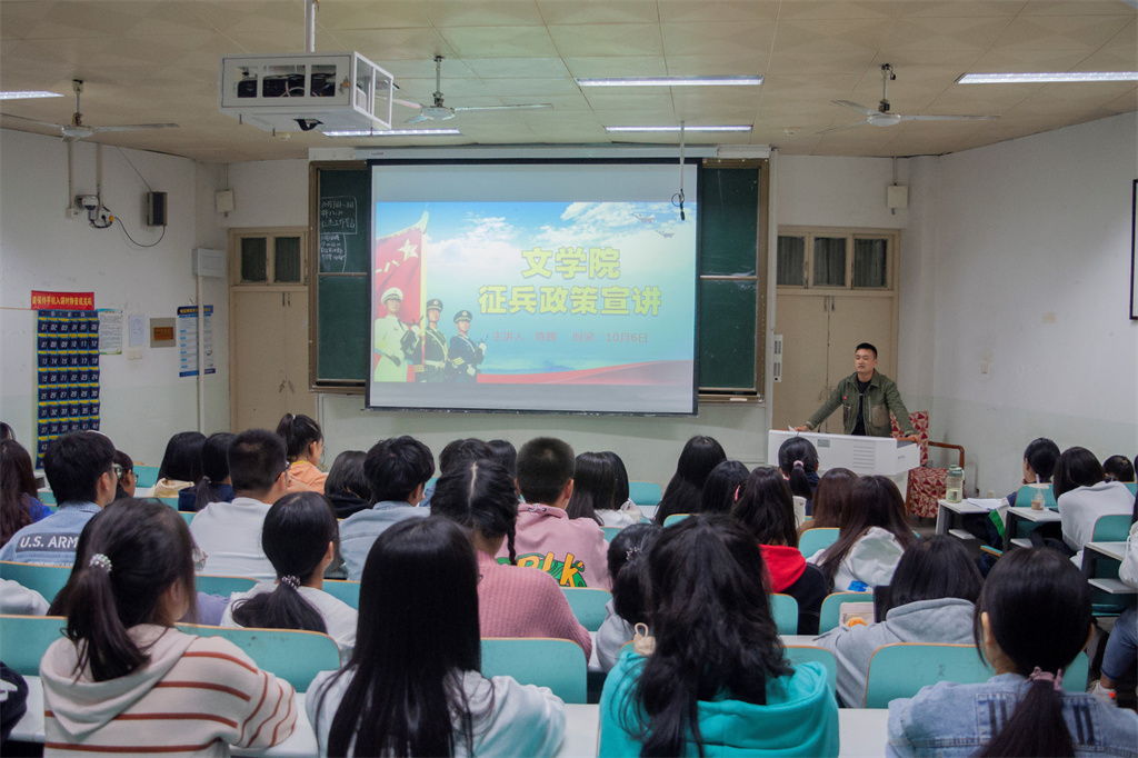 会议中,陈辉老师首先点明参军入伍的重要性与光荣性,提出大学生应征入伍是推动国家军队建设进步与发展的重要举措,是贯彻落实国防教育理念的有效方针。随后就信阳师范学院大学生参军入伍政策进行解读,首先具体介绍了国家参军入伍的优惠政策,并对此举实例来让同学们对这些政策有更为客观的了解。接着介绍了征兵需要的条件以及男女征兵流程,对部队军种分类讲解。最后同学们据征兵政策展开提问,陈辉老师一一回答提出的问题。