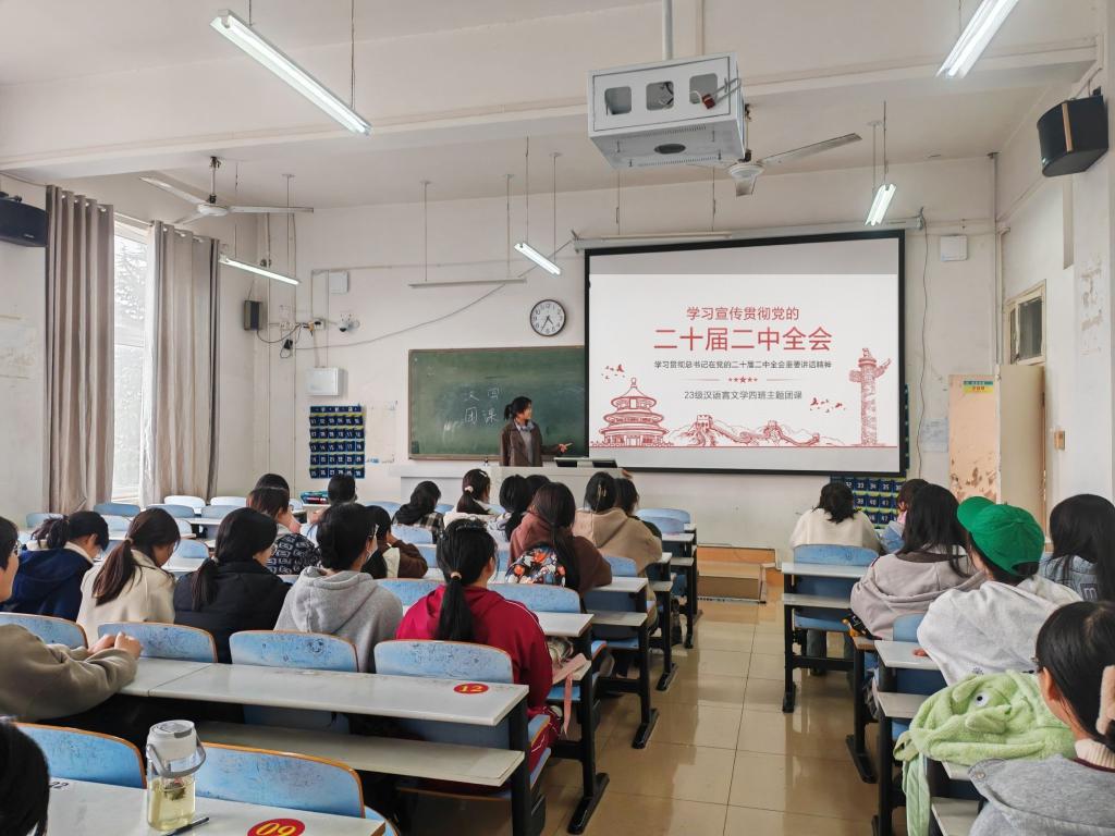 为深入学习和全面贯彻党的二十大精神和二十届二中全会精神,我院23级汉语言文学四班于5月9日在人文楼206教室开展“全面贯彻党的二十大精神”主题团课活动,引导广大青年学生自觉学习贯彻党的二十大精神和二十届二中全会精神,以奋发有为的精神把新时代中国特色社会主义不断向前推进。本次团课由四班团支书王金豆主持,四班全体同学参加了此次活动。