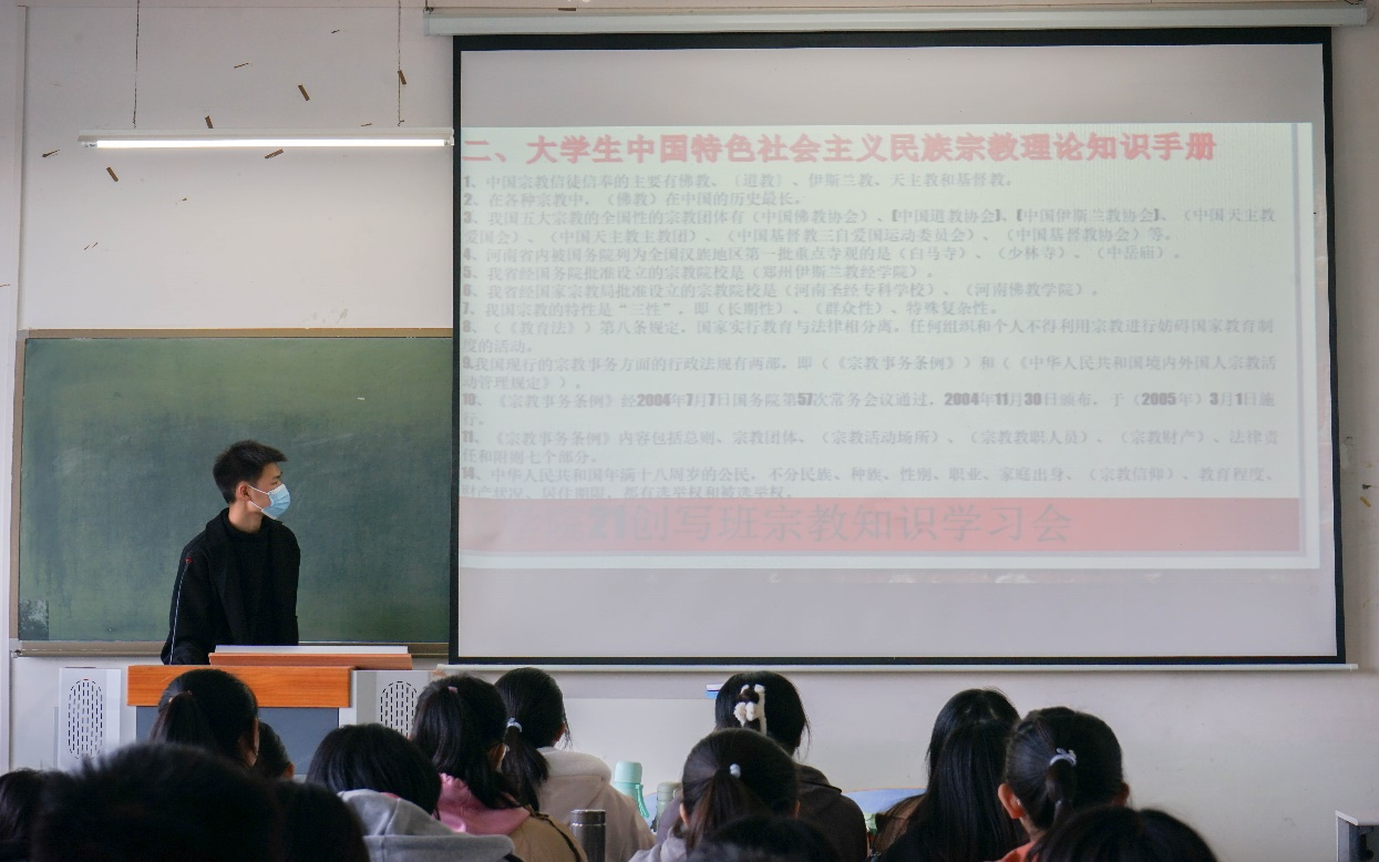 会上,主讲人以《习近平总书记关于民族宗教工作重要论述摘编》为依托,为同学们讲解了中国特色社会主义民族宗教理论、马克思主义宗教观、党和国家关于宗教工作的基本方针政策等有关内容。在主讲人的带领下,大家共同学习了《大学生中国特色社会主义民族宗教理论知识手册》和《宗教事务条例》的重要内容。结合校园宗教“全能神”的案例,生动详细地讲述了邪教对于青少年的危害,针对如何识破并防范邪教陷阱开展了教育学习,呼吁大家要主动提高辨别邪教的能力,对于宣传或参与邪教的行为要及时上报。最后,同学们纷纷踊跃发言,在会上分享了自己所了解有关宗教事务的基本知识以及参加本次主题班会的体会与收获。