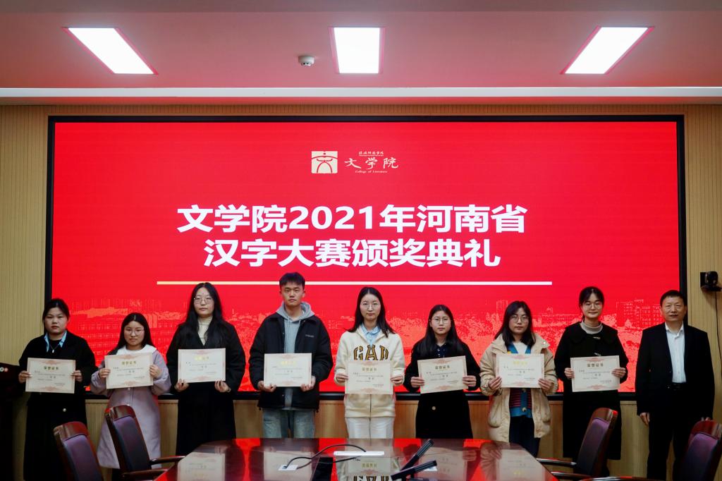 在2021年河南省汉字大赛中,全省高校组共有75所高校294名大学生参赛,决出一等奖24名,二等奖54名,三等奖167名,其中来自我院的张馨雅获得一等奖,牛冰艳、李鸿婕、任世龙三位同学均获得二等奖,栗君华老师和蔡亚玲老师荣获最佳辅导老师奖,信阳师范学院William威廉英国获得优秀组织奖。