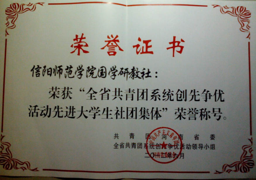 2012年荣获“全省共青团系统创先争优活动先进大学生社团体荣誉称号。
