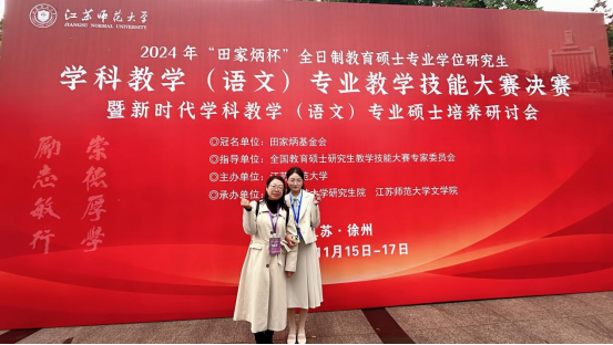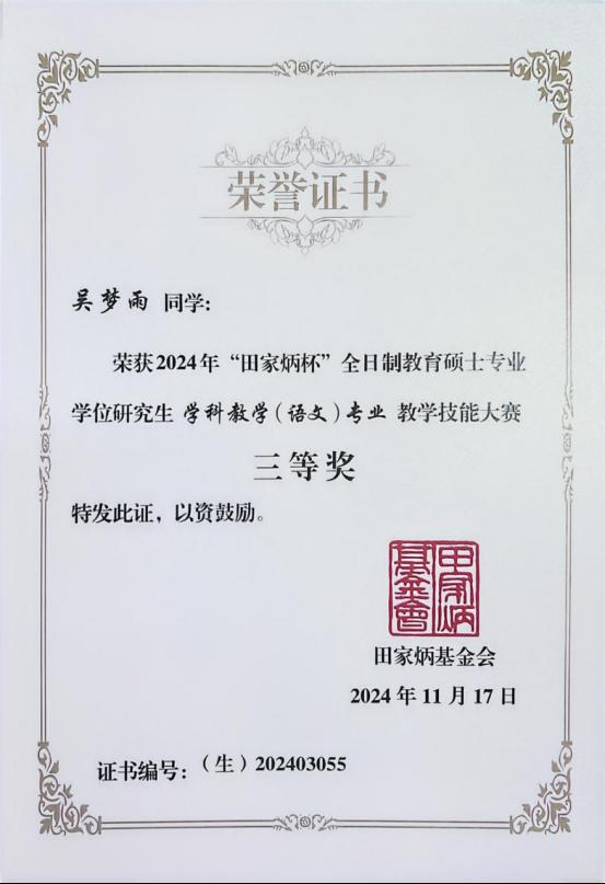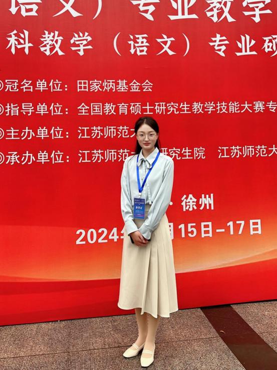 11月15日至17日,由教育部全国教育专业学位研究生教育指导委员会主办,田家炳基金会冠名的2024年全国“田家炳杯”全日制教育硕士专业学位研究生学科教学(语文)专业教学技能大赛决赛在江苏师范大学成功举办。我院2023级学科教学(语文)专业研究生吴梦雨同学在决赛中荣获三等奖。