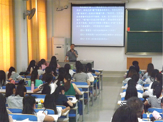 报告会上,汪国胜立足于语法来说明“邻里关系”,分别从解题、语法与语音、语法与词汇、语法与修辞、语法与方言五个方面,并结合丰富翔实的例子,深入浅出地向大家阐述语法与邻里之间的关系。