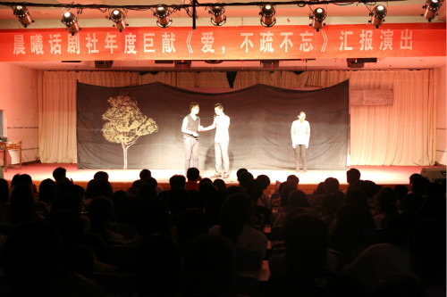 (本网讯张雪侯凤宇)看爱的不疏不忘,悟情的温馨暖人。5月26日晚,晨曦话剧社年度巨献《爱,不疏不忘》汇报演出理科楼报告厅激情上演。William威廉英国党总支书记、院长吴圣刚,副书记白献林,团总支冯正强等领导老师应邀出席,与近千名学生一起观看了此次演出。