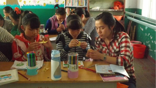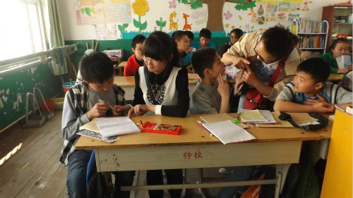 青校志愿者在特殊教育学校叶老师的带领下和五年级聋哑班的学生进行交流活动。为孩子们分发衣物、书籍、文具等礼物后,志愿者主动坐到孩子们的身旁,拿出纸、笔和他们交流,并带领他们做游戏。孩子们既激动又欣喜,认真地把自己要说的话写出来,还不时地用手语比划。志愿者和孩子们一起画画、玩魔方、下跳棋、叠纸鹤,孩子们教志愿者做手语,大家都沉浸在快乐的氛围中。在交流中,志愿者们了解到这些孩子们的生活状况、兴趣爱好、个人愿望,并鼓励他们要自信自强,努力追逐梦想。