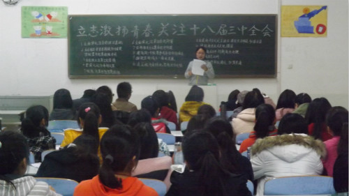 各个班级周密策划,精心安排,开展了形式多样、内容丰富的主题班会。其中,汉语言文学三班的同学们回顾了中国共产党自十一届三中全会以来走过的风雨历程。他们充分肯定了我党在改革实践中始终坚持解放思想、实事求是、总结经验、开拓创新,为国家富强、人民富裕做出的卓越贡献。同学们进行了激情洋溢的即兴演讲,抒发强烈的爱国之情,坚定了为振兴中华而努力奋斗的决心。此外,秘书学班别出心裁地以此次主题班会为契机,制定了符合班级现状的管理制度。汉语言文学一班则组织学生观看十八届三中全会的相关会议视频,并鼓励同学们踊跃发言,共同交流心得体会。