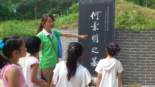 景明墓前,志愿者向小学生详细介绍了何景明的历史地位和文学贡献,帮助其了解景明文化,丰富孩子们知识和见闻同时,有助于传承中华民族优秀传统文化。