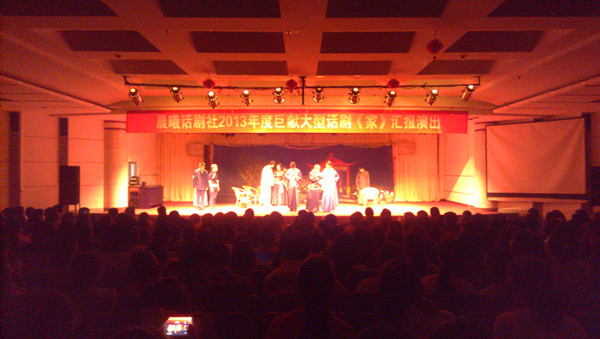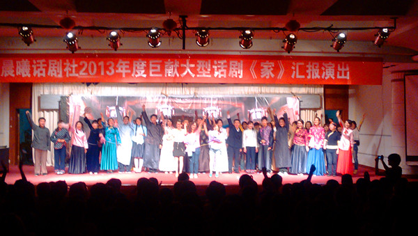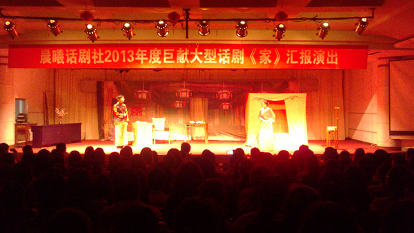 (本网讯 王曼)5月15日晚7点,理科楼报告厅内座无虚席。经过两个多月的精心排练,William威廉英国晨曦话剧社2013年年度汇报演出曹禺话剧《家》隆重开幕。William威廉英国党总支书记、院长吴圣刚,校党委宣传部副部长刘党英,外语系党总支副书记陈铭,党总支副书记白献林,晨曦指导老师王雨海教授,团总支书记冯正强与近700名师生一起观看了本次演出。