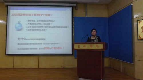 讲座伊始,白书记上台发表简要谈话,表示了对沈教授开讲的热烈欢迎。沈教授在热烈的掌声中走上讲坛,为听众倾情奉上了精彩绝伦的文化盛宴。她结合自身学习、生活、工作经验,从“阅读与心智成长”、“阅读分类”、“阅读层次”等方面向大家讲述了阅读的技巧和方法,加深了听众们对阅读的认识。紧接着,沈教授结合具体作品深入浅出地阐释了阅读时应注意的细节问题,如“确定书目的范围”、“注意作者的主旨”、“为书拟题大纲”等具体步骤。她指出,读书是一个由浅入深、循序渐进的过程,希望同学们能坚持不懈,认真对待,积极追求阅读的最高层次,在日积月累中提升自己的人文修养、情感厚度和思想深度。