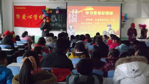 (本网讯 高瑞廷 张琪 陈梦艳)“学习雷锋好榜样……”3月2日下午,在信阳师范学院理科楼203教室不时传来阵阵掌声。原来,爱心学校、爱心服务社、南风通讯社和社会调查研究协会携手红星一小、飨堂小学联合举办的“弘扬雷锋精神,关爱你我他”活动在此如火如荼的开展。信阳市青年志愿者协会副会长、青联委员王相亚,信阳师院物电学院团支部书记刘华超应邀参加了此次活动。