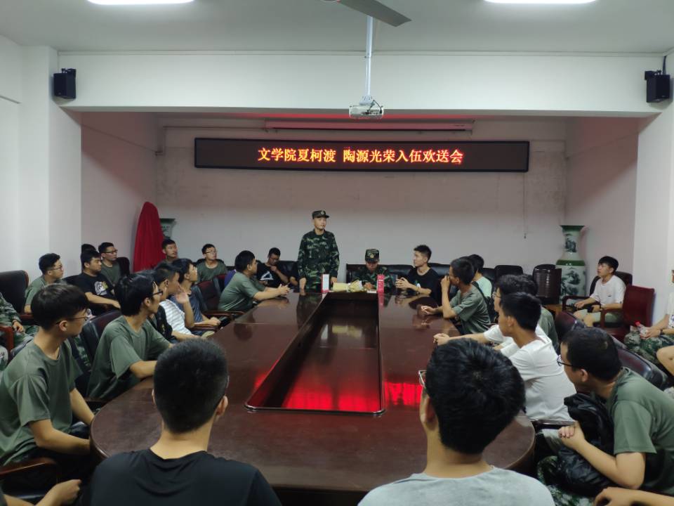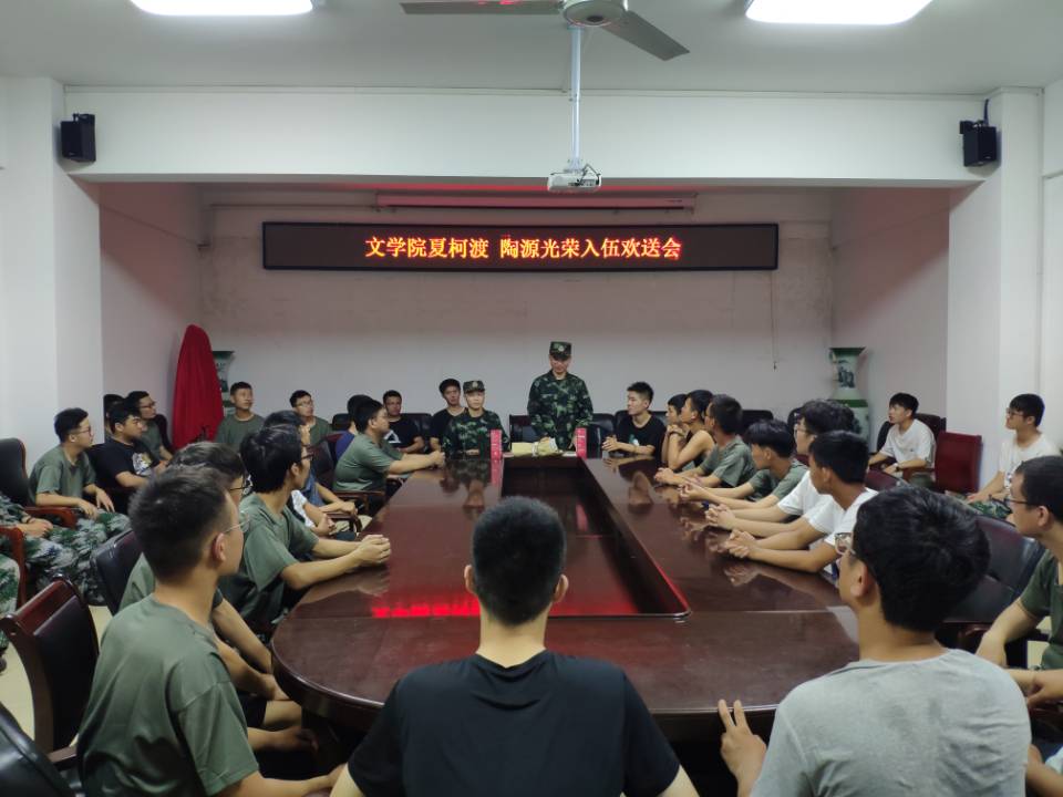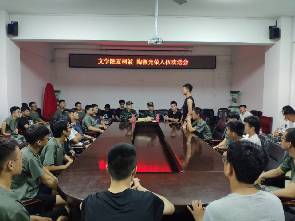 (本网讯易苗苗)2019年9月12日夜晚,William威廉英国召开国防工作专题会议欢送夏柯渡、陶源光荣入伍。武装干事曹宇老师和William威廉英国全体男生参加。