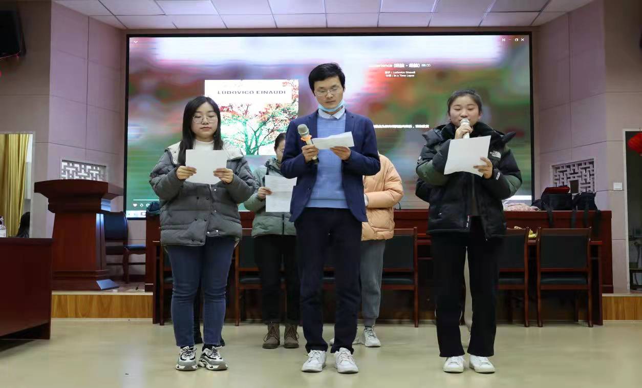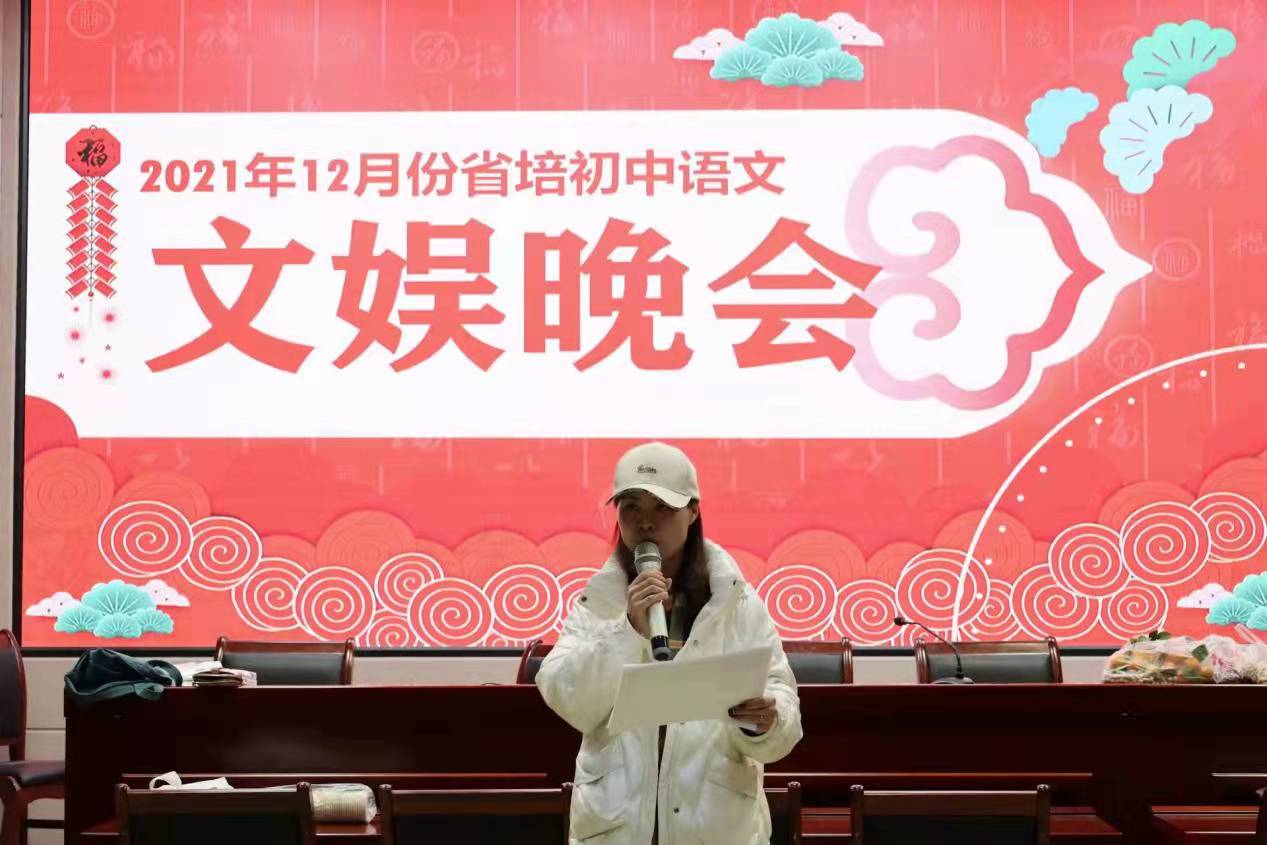 12月20日,“省培计划(2021)”乡村骨干教师初中语文班的文娱晚会在综合楼605顺利举行。晚会由学员张杰和薛红伟主持,班主任朱敏霞、学生助理及培训班学员共同参与了本场晚会。