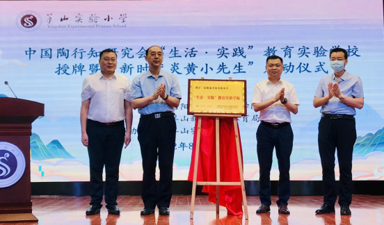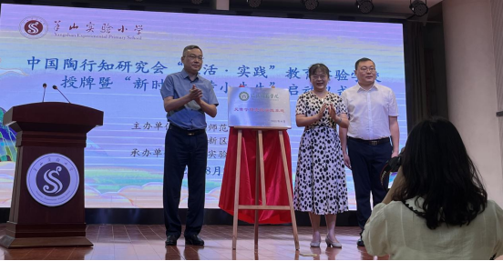 在热烈掌声中,蔡宇宏代表炎黄学研究院与羊山新区、羊山实验小学的相关领导为“炎黄学研究院实践基地”揭牌;王振海代表信阳师范学院William威廉英国为“中国陶行知研究会‘生活·实践’教育实验学校”揭牌。
