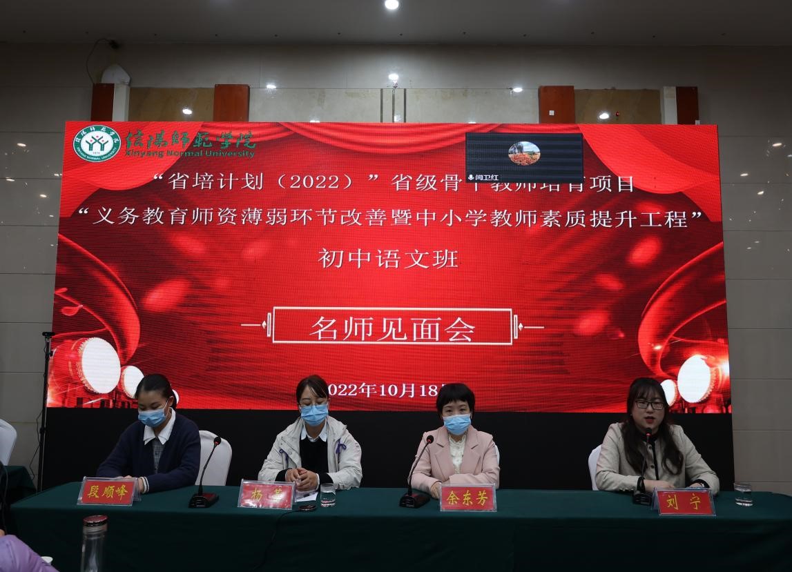 10月18日上午,我院2022“省培计划”省级骨干教师培育项目初中语文班名师见面会暨教学微论坛于浉河宾馆会议室举行。本次会议由班主任刘宁主持,采取了线上、线下相结合的方式,省培项目名师余东方、陈晓辉、杨蕾、段顺峰、闫卫红、王越、刘艳及本次培训班学员共同参加。