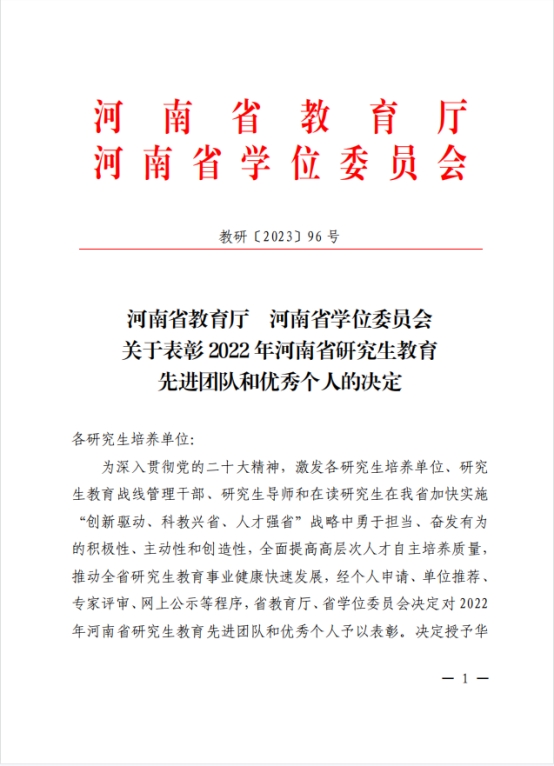 近日,河南省教育厅、河南省学位委员会公布了《关于表彰2022年河南省研究生教育先进团队和优秀个人的决定》(教研〔2023〕96号),我院中国古代文学荣获河南省优秀研究生导师团队,陈晓晖(信阳市羊山中学,校外兼职导师)荣获河南省优秀研究生指导教师,温昕(学科教学语文,指导教师:赵婧)荣获2022年河南省研究生创新之星。