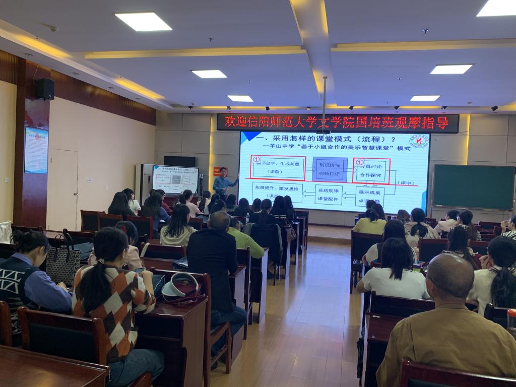 10月25日上午,“国培”骨干教师初中语文班的学员在班主任毕晋老师的带领下,来到信阳市羊山中学进行观摩学习。