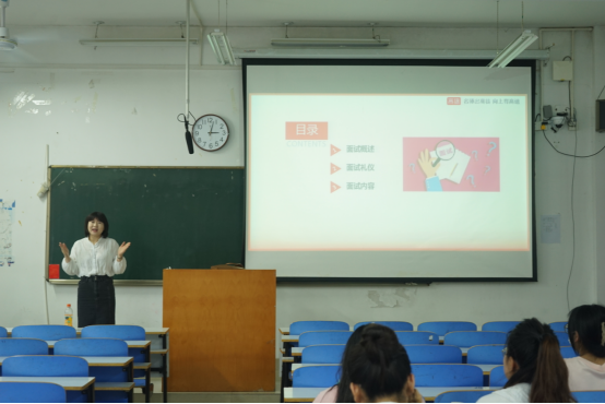 讲座伊始,安妮老师为大家详细介绍了面试的流程,从候考、抽题、备课,再到考试过程中如何回答规定的问题并进行试讲答辩以及考官评分标准等多方面为大家进行解答。随后,安妮老师还从知识、仪表和心理三个角度向同学们讲述了面试之前需要进行怎样的准备,并特别强调了面试者保持放松状态的重要性,鼓励同学们以昂扬自信的良好精神面貌去面对教资面试。接着,安妮老师为大家演示了面试的基本步骤和过程,提醒同学们要注意看清自己的考题,把握好时间以及讲课时的发音和语速,做好自我表情的管理。讲座最后,参与学生就自己的疑问向老师提出问题,安妮老师对问题进行一一解答。